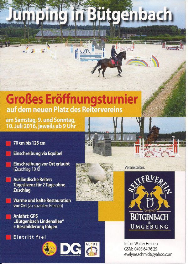 Segen für die neue ReitsportanlageAm Freitag, 8. Juli, wird um 19 Uhr gegenüber der Pferdezucht Heinen die neue Reitsportanlage unseres Reitervereins für Parcours– und Dressurspringen, die den Reitern optimale Trainingsbedingungen schafft, gesegnet. Beim Springen kann ein kompletter Parcours aufgebaut und gesprungen werden. Bevor das erste Turnier auf dieser Anlage stattfindet, bitten wir um Gottes Segen. Zudem werden wir der Verstorbenen des Reitervereins gedenken. Wir gratulieren dem Bütgenbacher Reiterverein zu der neuen Reitsportanlage.