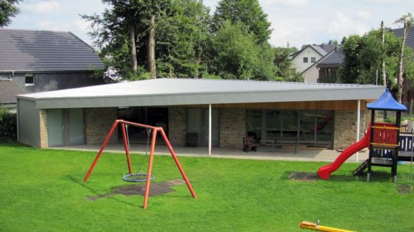 Wenn man aus westlicher Richtung durch das Tor den Spielplatz betritt, sieht man die Front mit dem Eingang und die überdachte Terrasse. Die beiden Seiten, die sich in Richtung Spielplatz öffnen, wurden aus Bruchstein gemauert und haben mehrere Öffnungen zur Belichtung. Der Versammlungsraum lässt sich mittels großer Türen in Richtung überdachter Terrasse öffnen. Im Eingangsbereich ist außerdem eine Sitzbank angebracht, von der man eine gute Aussicht auf den Spielplatz hat.