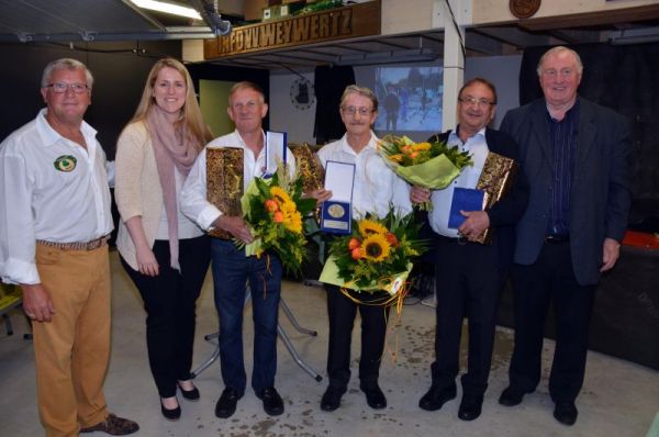 Im Rahmen der Feier durfte die Ministerin drei Mitglieder mit der silbernen Verdienstmedaille der Deutschsprachigen Gemeinschaft ehren. Paul Hermann und Josef Gilles würden für 28-jährige und Oswald Sarlette für 32-jährige Mitgliedschaft geehrt. VV-Präsident Aloys Krings ließ es sich nicht nehmen, seine engsten Mitarbeiter im VV-Vorstand hervorzuheben, darunter Vize-Präsident Emil Bodarwé "für sein nicht zu bremsendes Engagement und Organisationstalent", Gerd Krause, der als Schriftführer unzählige Anträge ausgefüllt und Briefe geschrieben hat und zudem die Elektroinstallation montiert hat, sowie René Sarlette, der als Kassenwart "viel gerechnet hat, damit es zu keinen Engpässen kam."