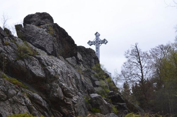 Die Pilger aus dem Pfarrverband Bütgenbach starteten um 5.00 Uhr morgens ab Pfarrkirche Weywertz in einem Tross von Fahrzeugen in Richtung Ruitshof/ Küchelscheid, wo sich bereits zahlreiche Pilger eingefunden hatten. Von dort aus ging es in einem etwa drei Kilometer langen Fußmarsch betend zur Richelsley, dabei mischte sich in das Rosenkranzgebet vielfaches Vogelgezwitscher auf dem langen Waldweg. Am mächtigen Felsen angekommen, lichtet sich der Wald, der Platz vor der Mariengrotte wird von Birken und einer mächtigen Buche umrahmt. Über allem ragt das Kreuz im Venn in den noch dunklen Himmel, der langsam die Konturen des Wahrzeichens freigibt. Vor 128 Jahren ließ Pfarrer Arnoldy von Kalterherberg das mächtige Kreuz am 28.Juli 1890 errichten.
