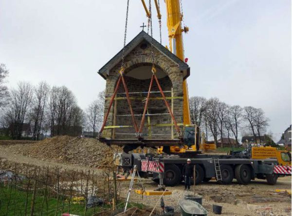 Aufgrund der im Frühjahr begonnenen Bauarbeiten zur Erweiterung des Seniorenheims Hof sollte die Kapelle einen neuen, sichtbareren Standort, direkt am neuen Rundbau erhalten. Die große, schwere Marienstatue fand unterdessen in der Seniorenheimkapelle eine vorläufige Bleibe. Mit einer von Bauleiter Karl-Heinz Bodarwé angeregten Versetzungsaktion am 22. April 2016 wurde die immerhin 25 Tonnen schwere Kapelle mit sechs Eisenträgern von einem 120-Tonnen-Kran aus Arlon vom alten Standort zur neuen Stelle "gehievt" und versetzt. Karl-Heinz Bodarwé, der diese Aktion mit "himmlischen Beistand" leitete, war es wichtig, den Ursprung der Kapelle im Gesamtbild zu erhalten, um den Erbauern die Ehre und Freude über das damalige Werk zu erweisen und zu erhalten. "Trotz der gewagten Aktion hat die Kapelle keinen einzigen Riss abbekommen", freute sich Karl-Heinz Bodarwé, der den Erbauern aus den Jahren 1996 und 1997 zu dem "guten Mörtel" und für die "fachmännische Arbeit" gratulierte.